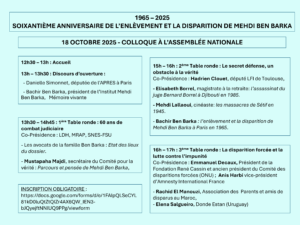 A l’invitation de l’Institut Mehdi Ben Barka, ¿Dónde Están? a participé au colloque organisé à l’Assemblée Nationale le samedi 18 octobre 2025 pour commémorer la disparition forcée à Paris, le 29 octobre 1965, du militant politique marocain Mehdi Ben Barka.