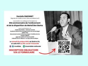 A l’invitation de l’Institut Mehdi Ben Barka, ¿Dónde Están? a participé au colloque organisé à l’Assemblée Nationale le samedi 18 octobre 2025 pour commémorer la disparition forcée à Paris, le 29 octobre 1965, du militant politique marocain Mehdi Ben Barka.